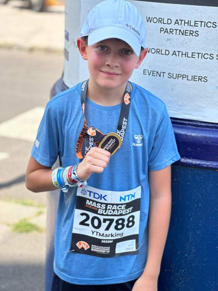 Ha már sport, akkor egy kicsit atletizáltunk is! Kint voltunk a családdal az atlétikai VB-n. Nem mondom, hogy szuper lelkes voltam, de azért érdekes volt látni a versenyt is. Sőt tulajdonképpen el is indultam a világbajnokságon. Illetve hát elindultam a világbajnokság maratoni pályáján… Egy 2 km-es versenyen. Nehezen vettem rá magam, de végül nagyon élveztem. 350. lettem közel 1500-ból! A végén egy csomó embert lehajráztam. Gé azt mondja, hogy Apánál is lehet hogy gyorsabban tudnék futni, márpedig ő ért az atlétikahoz, látja bennem a tehetséget. Reszkess, Fater!